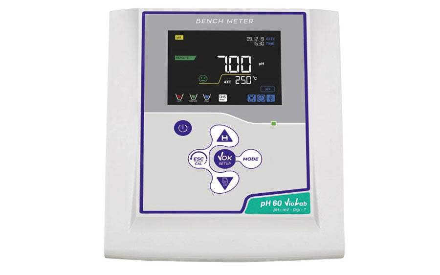 pH-mètre de paillasse avec écran LCD couleur haute définition innovant, avec possibilité de réglage de la luminosité. Mesure du pH, mV, ORP, avec affichage de la température. Possibilité de sélectionner les paramètres que vous souhaitez voir sur l'écran. Le guide en ligne de configuration et d'étalonnage permet une utilisation simple et immédiate de l'appareil. Étalonnage automatique du pH avec tampons USA et NIST jusqu'à 3 points et 2 points définis par l'utilisateur. Étalonnage automatique de l'ORP sur 1 point. Indication avec des icônes des valeurs étalonnées. Indicateur de stabilité de mesure et possibilité de sélectionner 3 niveaux de stabilité. Fonctions GLP : Date et heure, affichage des données d'étalonnage et réglage du délai d'étalonnage. Data Logger manuel et automatique avec possibilité de télécharger les données sur PC via micro-USB. Le logiciel Data-Link est téléchargeable gratuitement sur izitec.net. Connexion à une imprimante externe via un connecteur RS232. Toutes les opérations sont constamment surveillées et indiquées à l'opérateur via la LED colorée au-dessus de l'écran et les messages d'autodiagnostic. Gestion des capteurs numériques DHS.